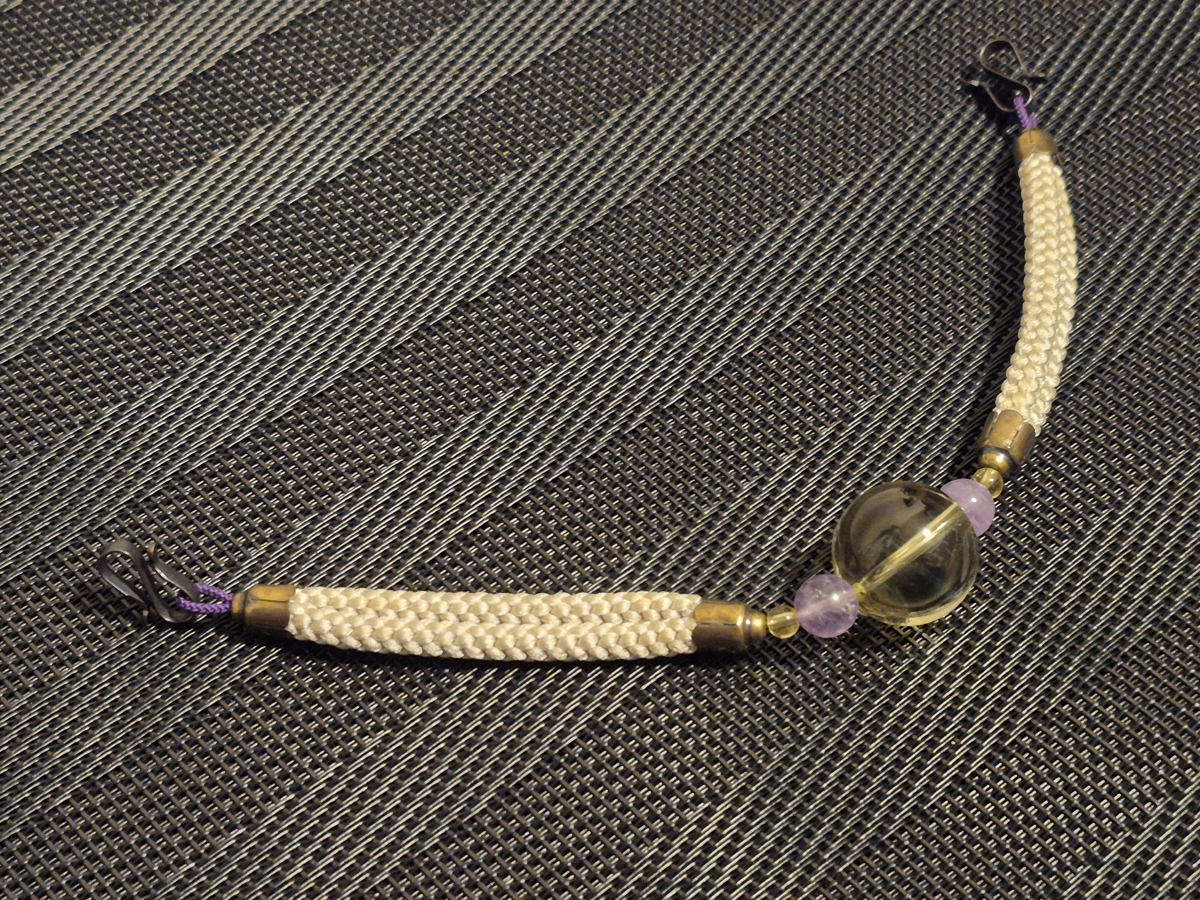 日本の伝統美を感じさせる「黄水晶の羽織紐」。美しい黄色の水晶が、着物スタイルを華やかに引き立てます。アメジストと白の組紐が絶妙に組み合わされ、上品でありながら個性的なアクセントに。