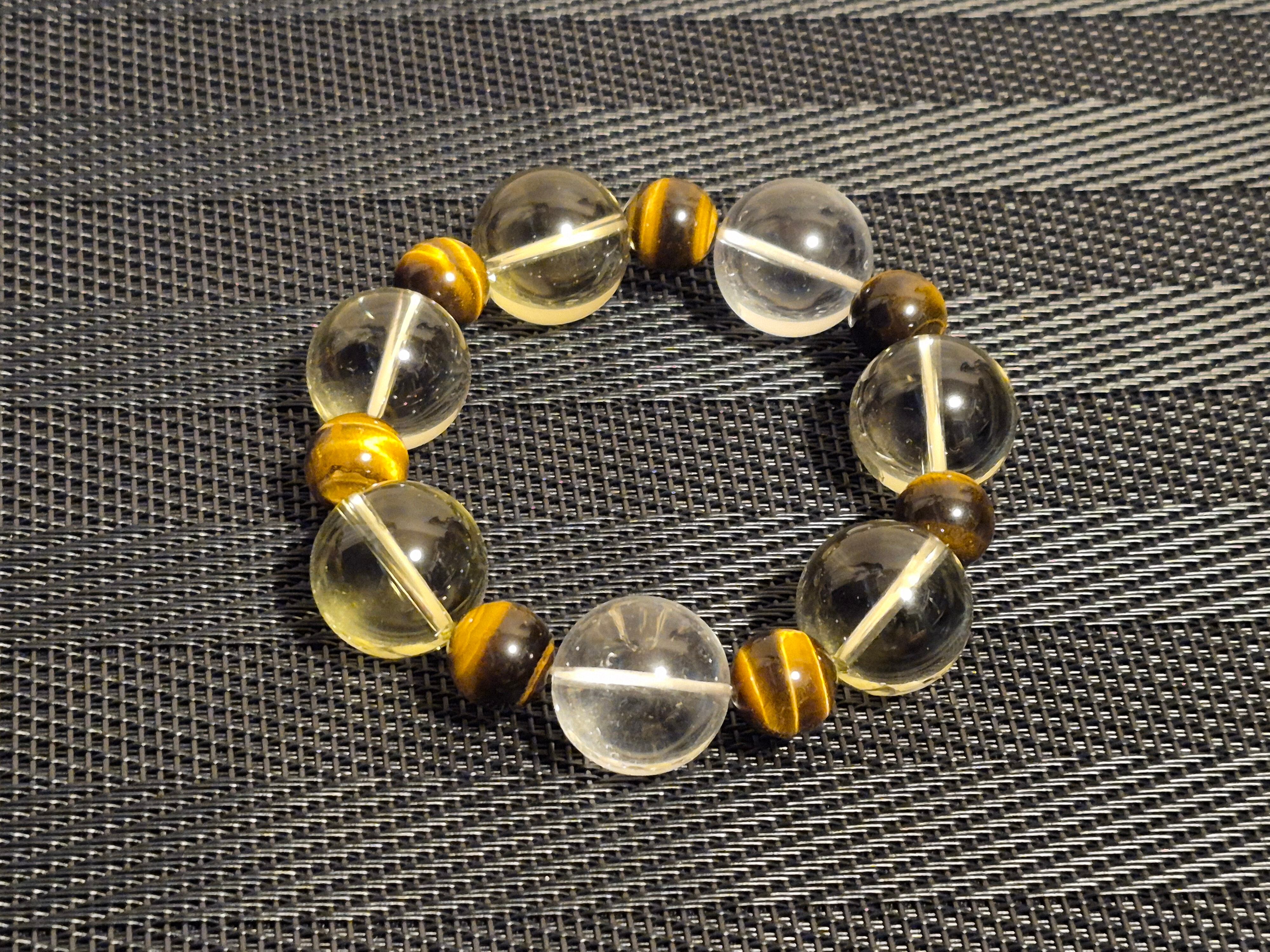 大きな水晶、黄水晶、タイガーアイを組み合わせた、存在感あふれるアイテムです。18mmの水晶と黄水晶、10mmのタイガーアイが力強い印象を与え、日常使いから特別なシーンまで幅広くお楽しみいただけます。